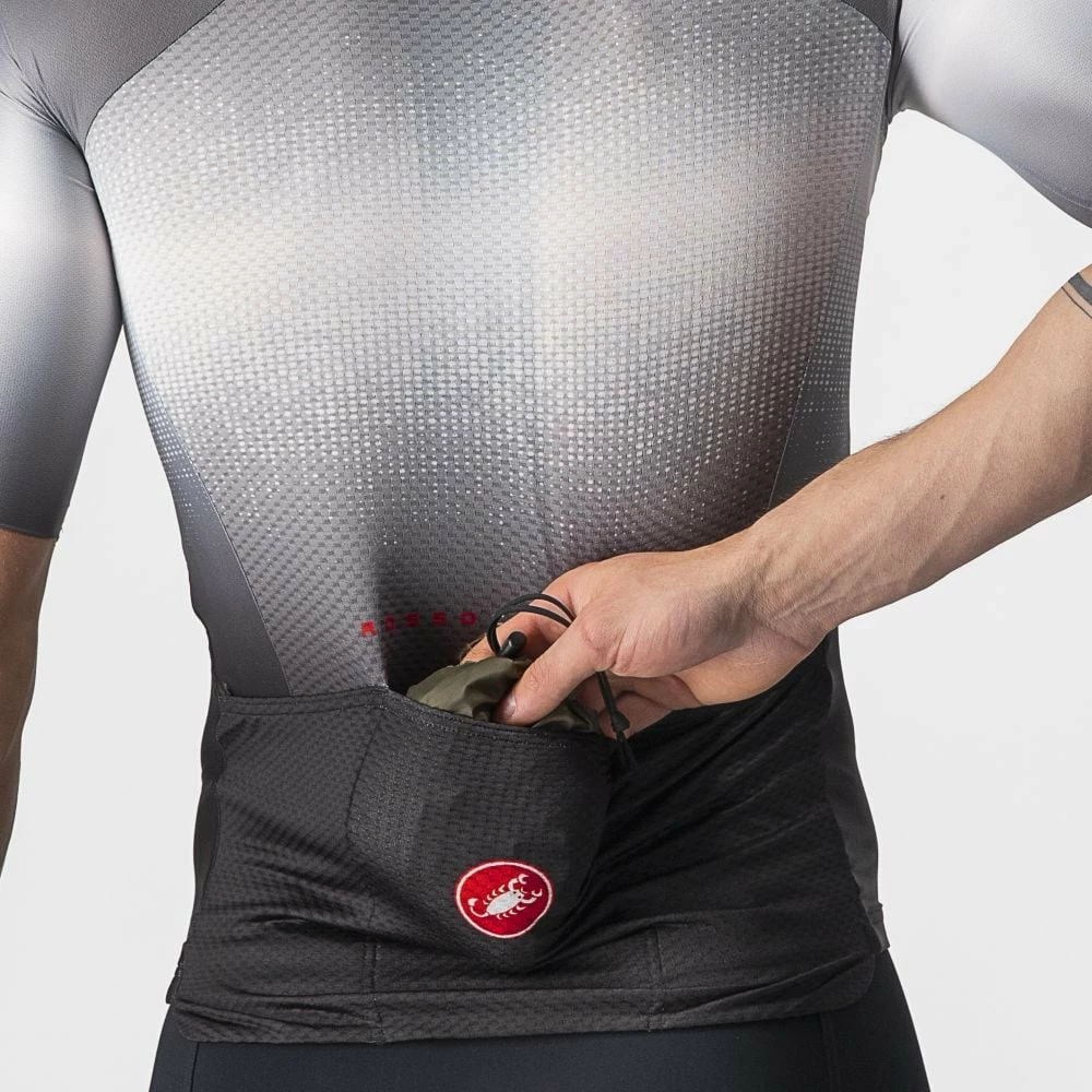 Eine extrem leichte, gut verstaubare Windjacke, mit körpernaher Passform dank atmungsaktiver Stretch-Einsätze. Damit können Sie den Temperaturbereich Ihres Lieblingstrikots von Castelli erweitern.