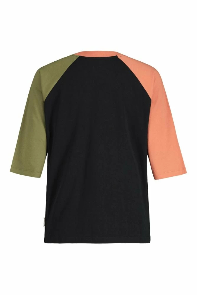 Lässiges Shirt mit breiter Kragenrippe und locker sitzenden Ärmeln, cooles Colorblock-Design, bunte Berg-Grafik auf der Brust.