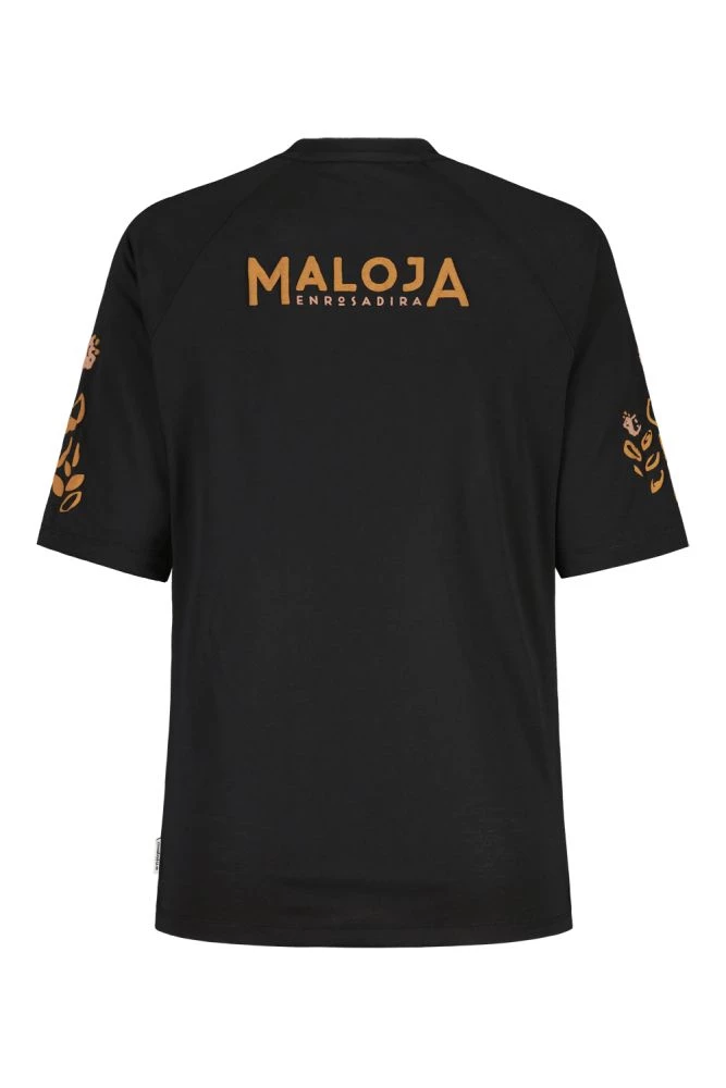 Das locker geschnittene Shirt besteht aus hochwertigem Naturalon, das schnell trocknet, sich dabei aber sehr natürlich greift und angenehm trägt. Die erhabenen floralen Rubberprints auf den Ärmeln und Maloja-Schriftzüge auf der Brust und im Nacken sind hübsche Designdetails.